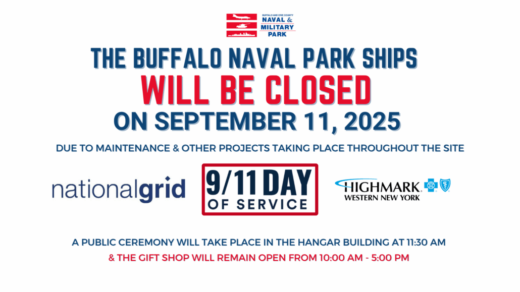 The Buffalo Naval Park will host a 9/11 ceremony in the Hangar Building at 11:30 AM that is free and open to the public. The gift shop will remain open from 10:00 AM – 5:00 PM.