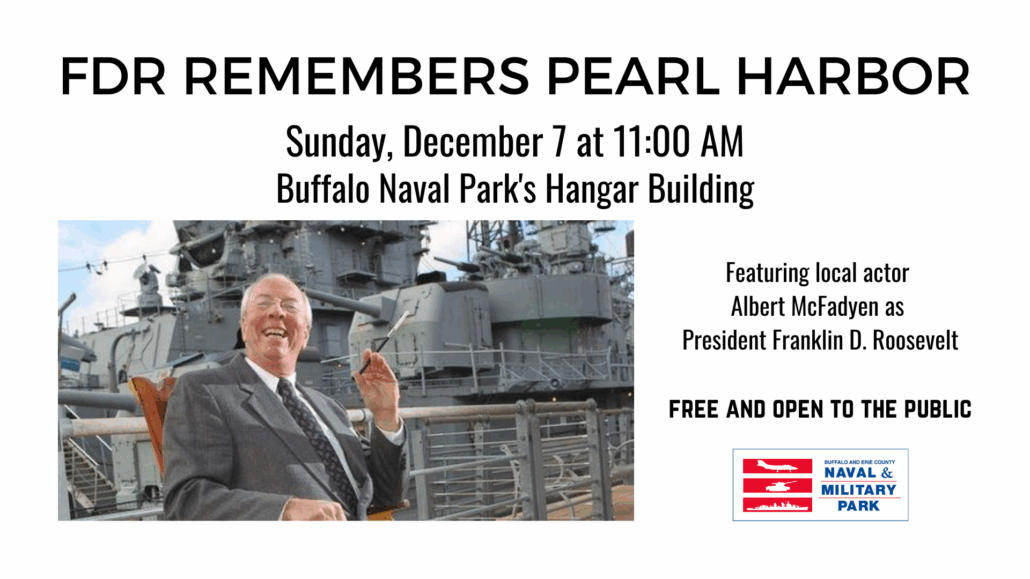 Local actor Albert McFadyen will reprise his role as Franklin Delano Roosevelt during a special program at the Buffalo Naval Park on Sunday, December 7 at 11:00 AM to commemorate the 84th anniversary of the Japanese attacks on the U.S. naval base at Pearl Harbor, Hawaii, in which more than 2,500 servicemen and civilians were killed and more than 1,200 were wounded.