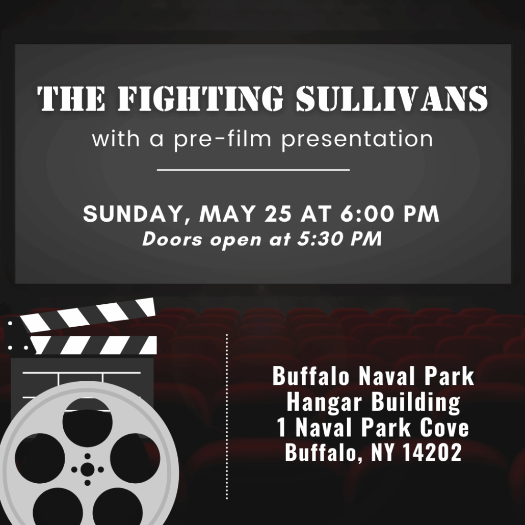 Join us for a special screening of the 1944 film, THE FIGHTING SULLIVANS, based on the lives of the five Sullivans brothers. The event will take place in the Hangar Building on Sunday, May 25. Doors open at 5:30 PM, and the movie will begin immediately following a pre-film presentation at 6:00 PM.