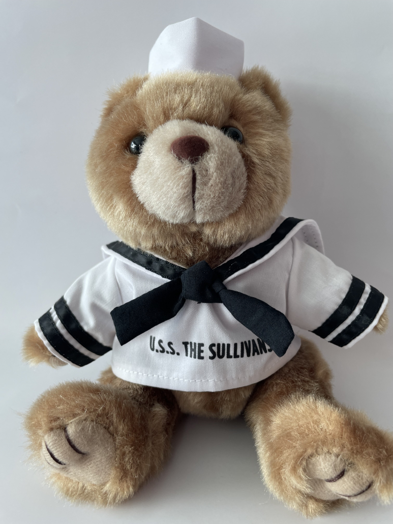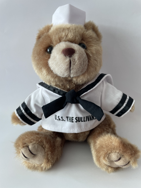Sully Sullivan, proudly wears a USS The Sullivans uniform. He is an 8 inch plush sailor bear, waiting to be a part of your life. He’s positioned so that he can sit and keep you company